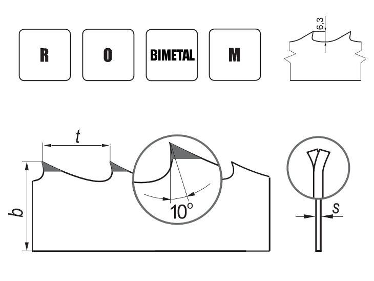 Piły taśmowe FENES posiadają standardową dla pił do drewna podziałkę 22,2 mm oraz kąt natarcia 10 stopni. Bimetaliczna piła trakowa Grom RO (rozwarta i ostrzona) przeznaczona jest do eksploatacji w najtrudniejszych warunkach pracy. Szczególnie sprawdza się przy cięciu drewna twardego, niekorowanego, zapiaszczonego i zmrożonego. Jej zęby wykonane są z szybkotnącej stali M42 o twardości 66-68 HRC i odznaczają się znacznie dłuższą żywotnością w stosunku do pił monolitycznych. Twardość taśmy również jest podwyższona i wynosi 47-52 HRC. Piła posiada profil WM 10/30 z pogłębionym zarysem zęba z 5,5 do 6,3 mm (seria M). Prędkość posuwu, tak jak wszystkich oferowanych pił uzależniona jest od twardości oraz czystości drewna i mieści się w przedziale od 2 do 8 m/min, natomiast zalecana prędkość skrawania wynosi ok. 30 m/s. Do ostrzenia piły zastosowanie mają ściernice korundowe oraz profilujące tarcze borazonowe.